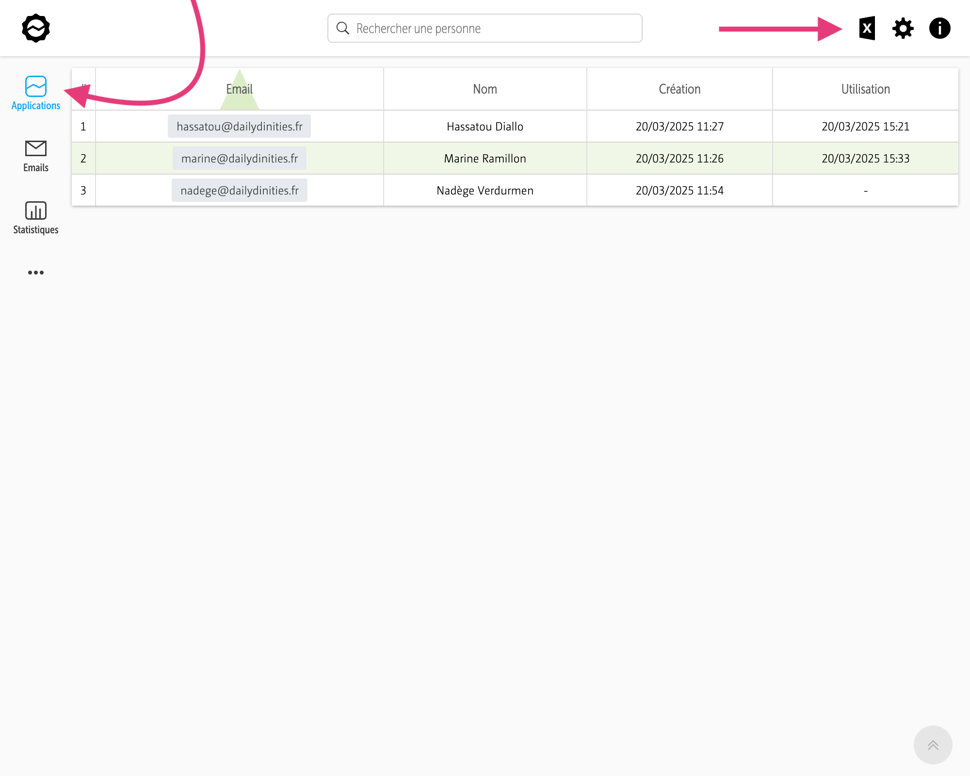 Cliquez sur l'onglet "Applications". Ce tableau liste tous les utilisateurs des applications avec la date de création du compte et la date de dernière utilisation. Ce tableau peut être exporté sous Excel.