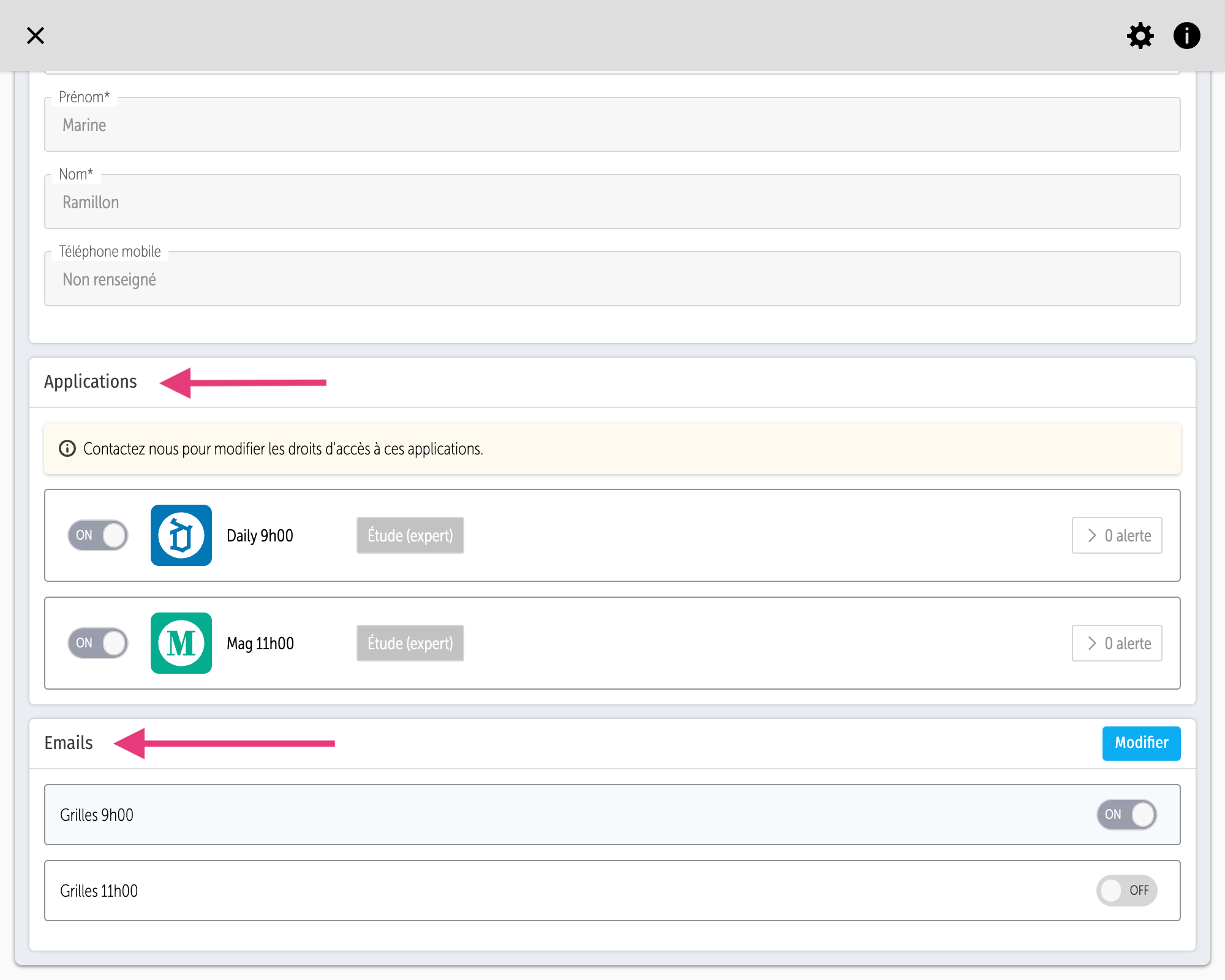 En cliquant sur le mail d’un utilisateur, une fiche s’ouvre avec le détail de ses abonnements aux applications et aux emails.