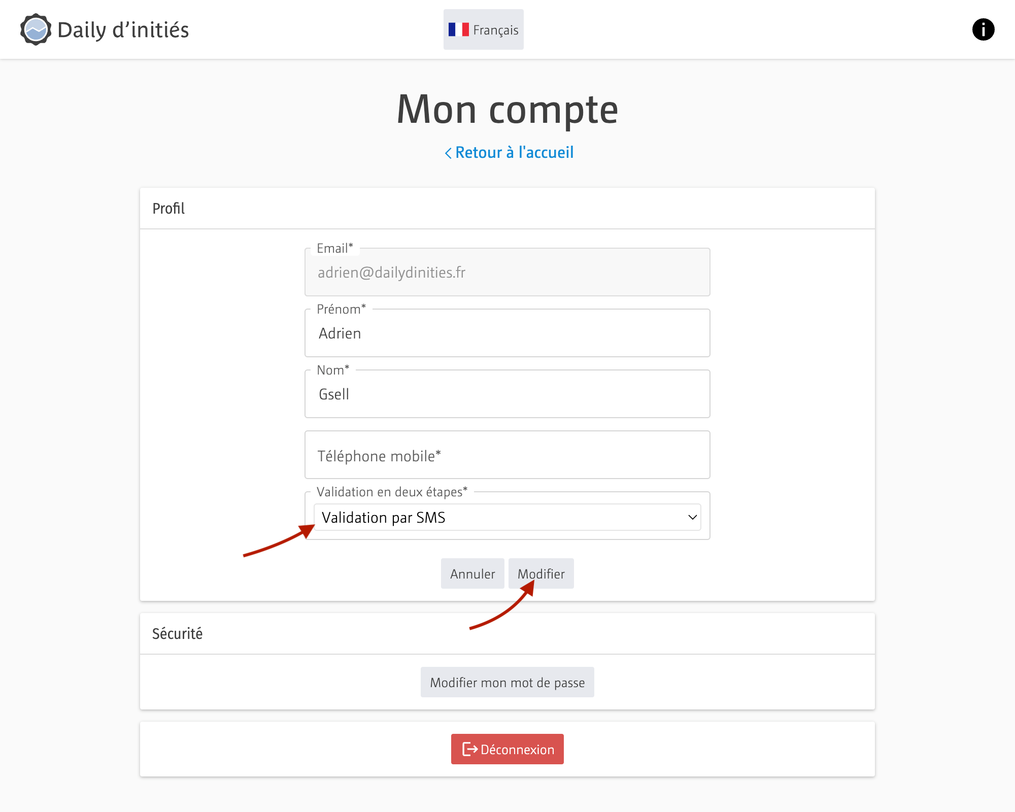 La ligne "Téléphone mobile" vous permet de modifier le numéro vers lequel sont envoyés les codes de validation.